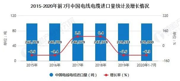 2015-2019年5年間我國(guó)電線(xiàn)電纜進(jìn)口量從26萬(wàn)噸降至23萬(wàn)噸,截止至2020年1-7月進(jìn)口量為12噸,同比下降6.3%,隨著行業(yè)進(jìn)口量的進(jìn)一步下降,電線(xiàn)電纜將迎來(lái)新的發(fā)展。